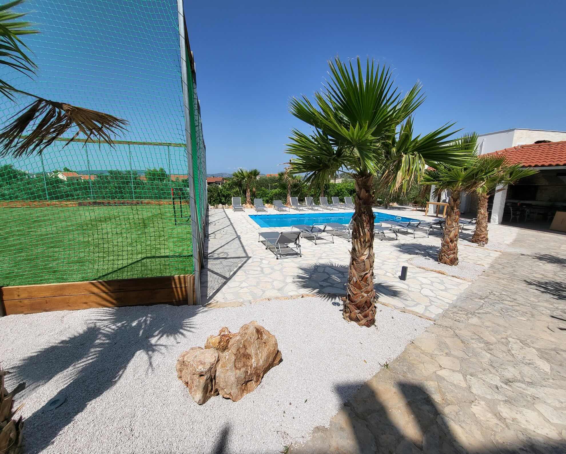 Sezónní venkovní bazén s lehátky a multifunkčním hřištěm.